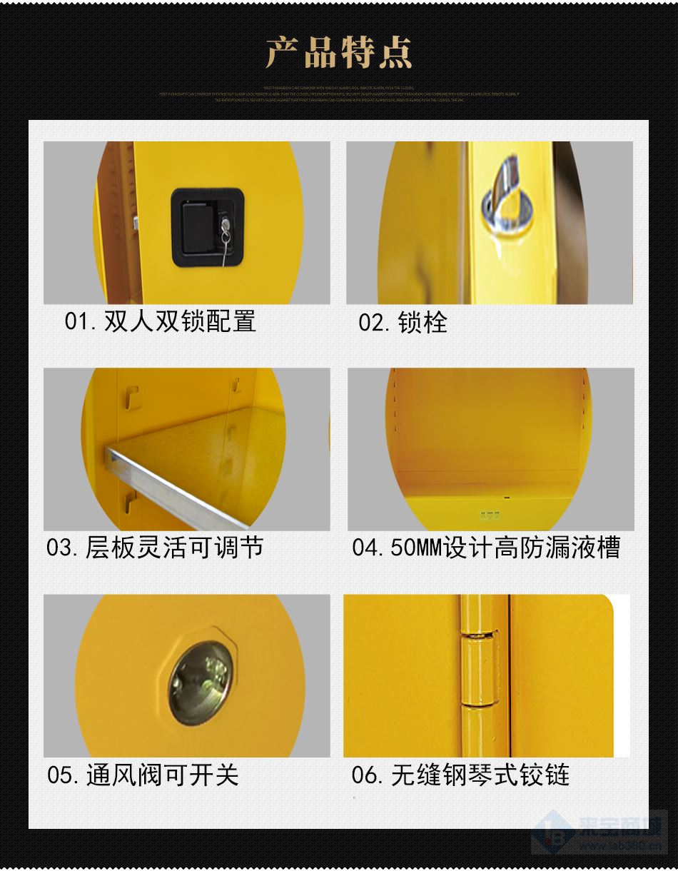安全存儲柜系類有黃(黃色指示易燃物品)、紅(紅色指示可燃物品)、藍(lán)(藍(lán)色指示弱腐蝕性物品)三種顏色,三種顏色的尺寸相同,儲放危險(xiǎn)品類型不同。