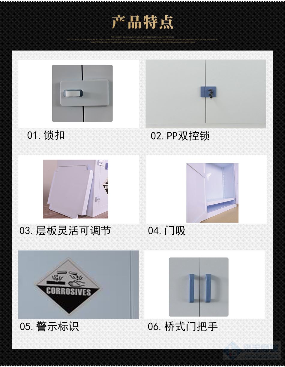 OLB系類強酸強堿存儲柜,特別針對強腐蝕性化學(xué)品的存儲和防滲漏而設(shè)計,PP藥品柜使用存放具有強腐蝕性的化學(xué)品物質(zhì)(例如硫酸、鹽酸、KOH、NaOH等化學(xué)品物質(zhì))。