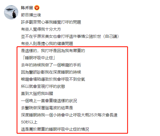1月6日,陳喬恩在社交媒體上自爆患有嚴(yán)重的睡眠呼吸中止癥
