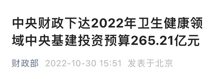 近日,據財政部官微消息,中央財政下達2022年衛生健康領域中央基建投資預算265.21億元,推動“十四五”102項重大工程和《“十四五”優質高效醫療衛生服務體系建設實施方案》等任務落地。