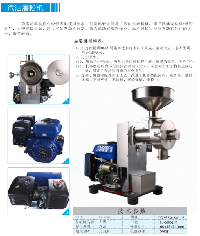 HK-860Q汽油磨粉機通過汽油發動機傳動,適合流動式磨粉作業,不銹鋼材質,,提高了機器零配件加工工藝。